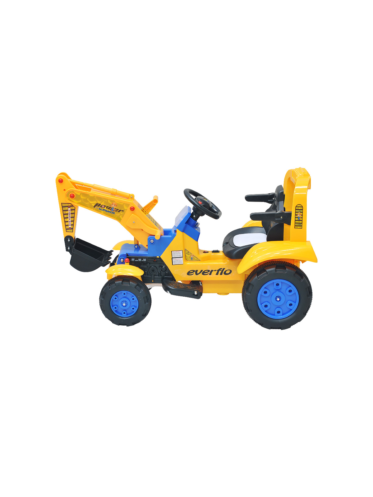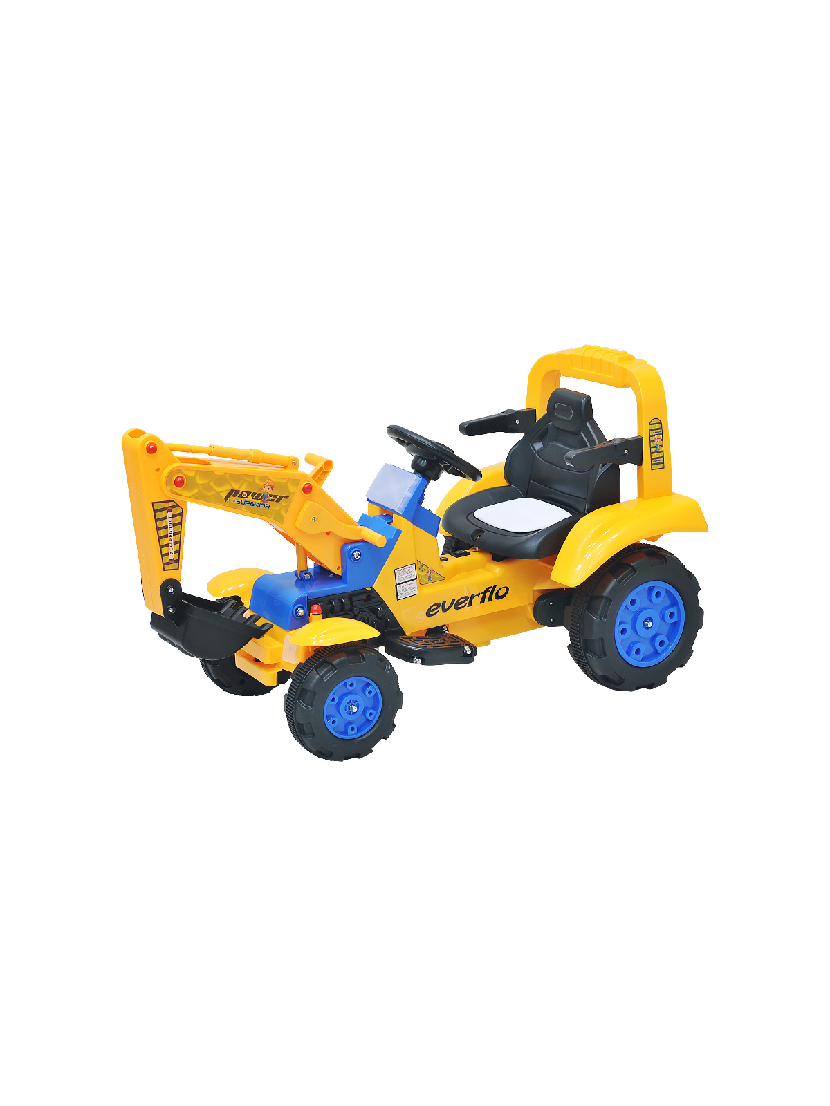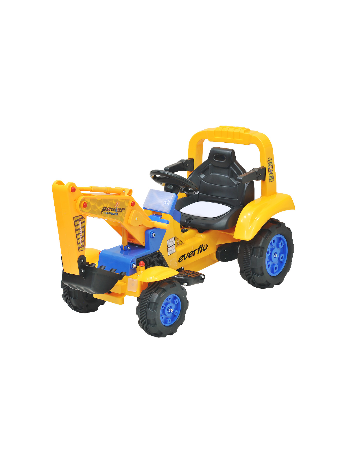 Электромашина Everflo loader ЕА001А (Еверфло Лоде) - уникальная машина, которая станет лучшим подарком для ребенка от 3-х лет. Модель представлена в виде строительной машины с ковшом, что несомненно оценят любители стройки. Машина имеет мощный аккумулятор, которого хватит на примерно 30 минут беспрерывного катания. Скорость машинки 2-4 км/час, что обеспечит необходимую безопасность для малыша. Предусмотрена 1 скорость вперед и одна назад. Для более увлекательной поездки предусмотрено гнездо для подключения mp3 плеера. Так же есть музыка и сигнал на руле. Ковш управляется рычагами, что, несомненно, понравится ребенку.