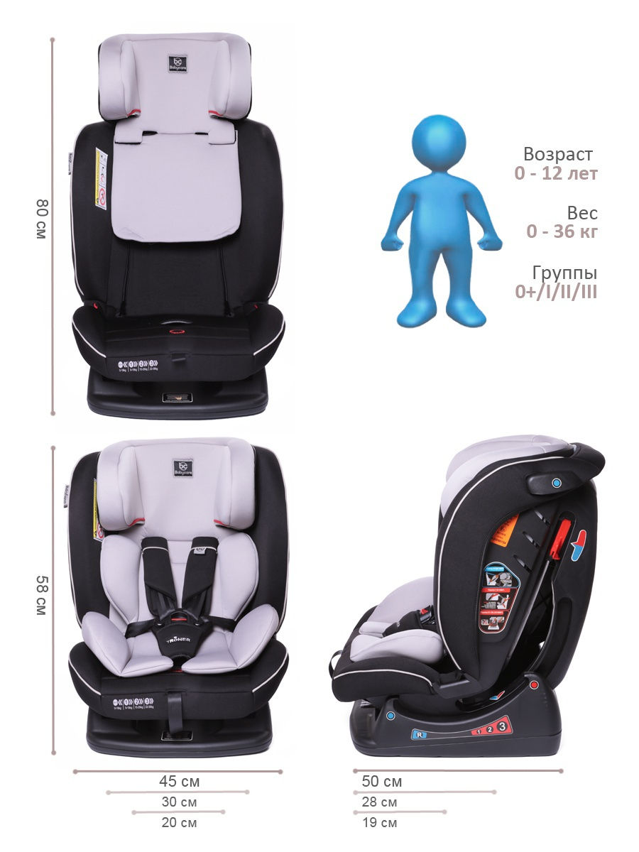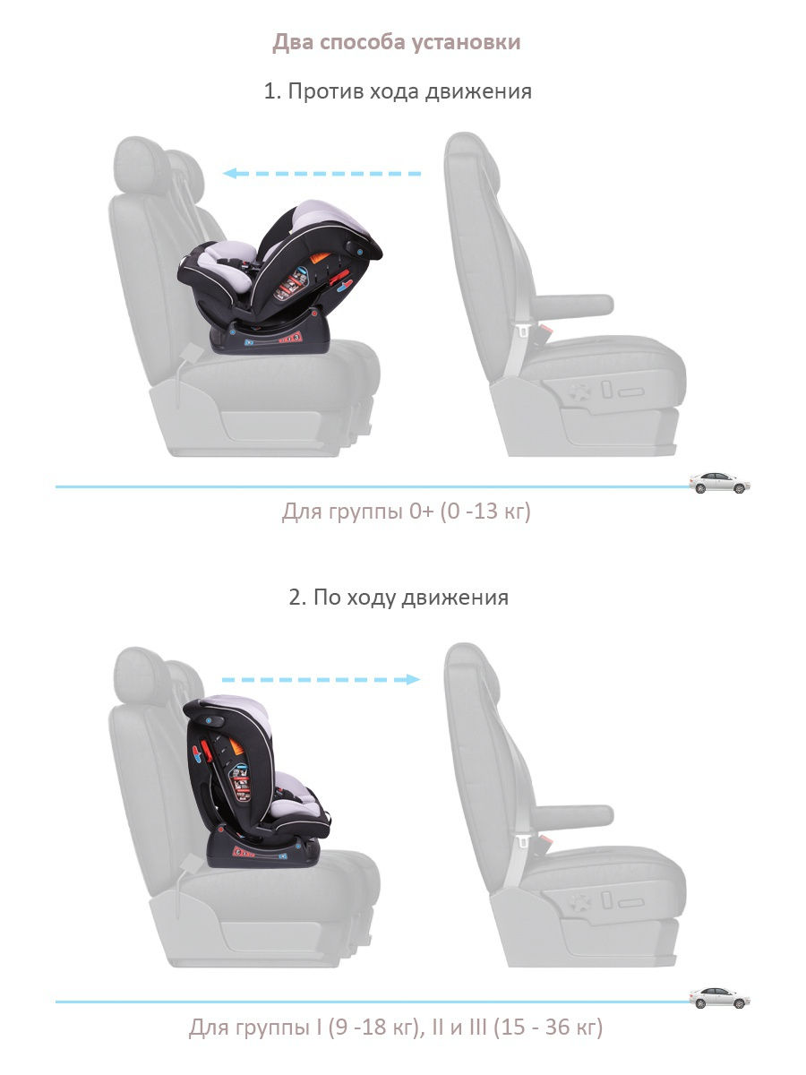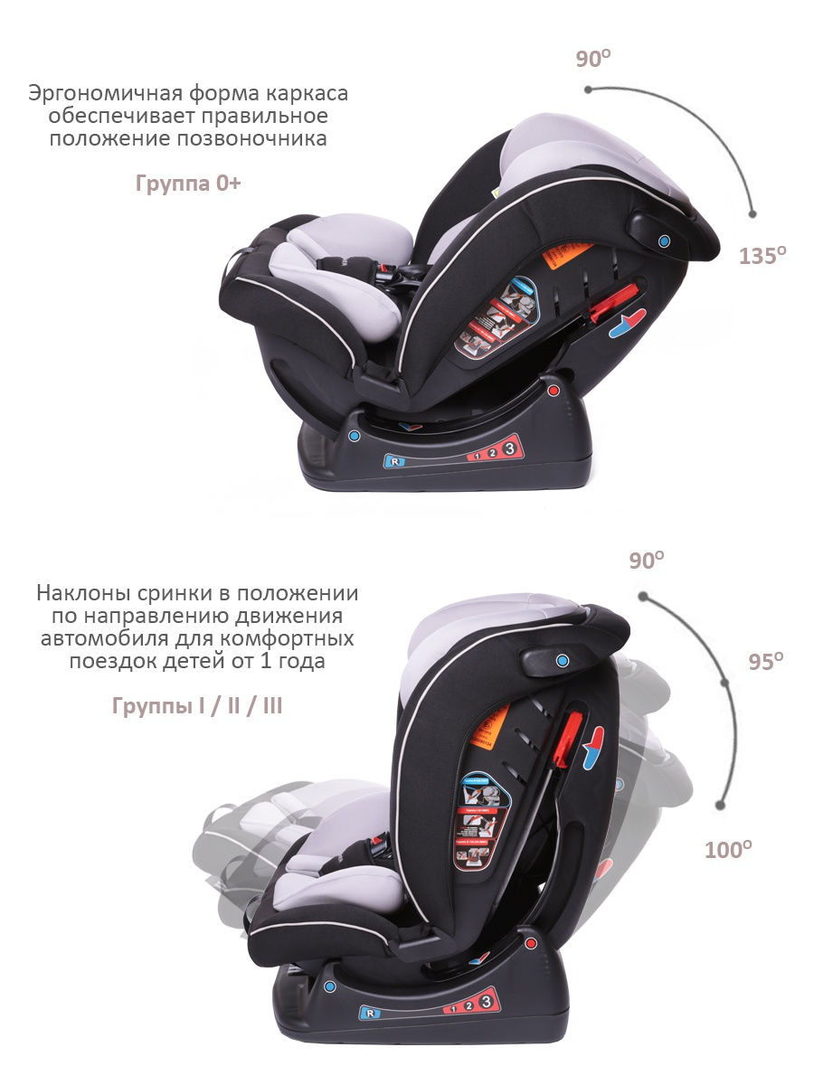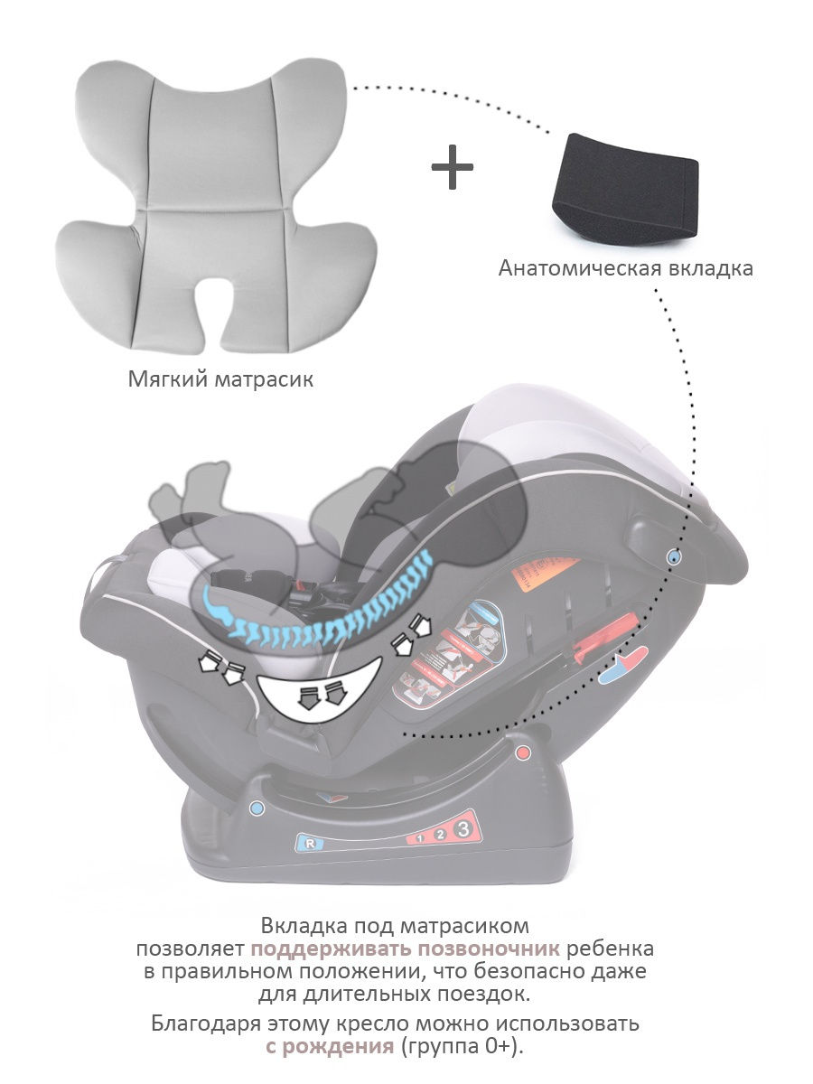 Для самых маленьких предусмотрен мягкий вкладыш с анатомической вкладкой. Для новорожденного кресло опускается практически до горизонтального положения. По мере взросления наклон спинки регулируется до сидячего положения, поднимается подголовник, убирается вкладыш, делая кресло широким и удобным для ребенка постарше. Кресло устанавливается по ходу и против хода движения.