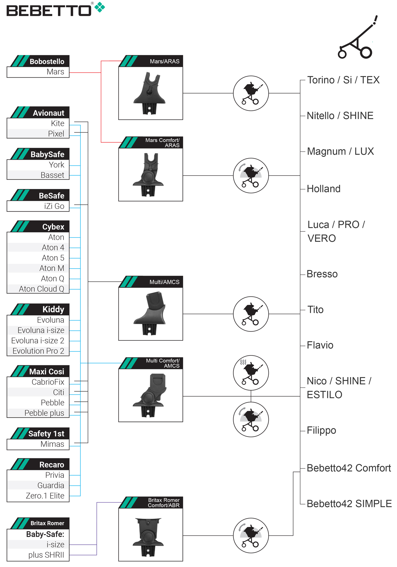 Данная модель уже идет в комплекте с адаптерами для установки кресла на раму вашей коляски Bebetto.