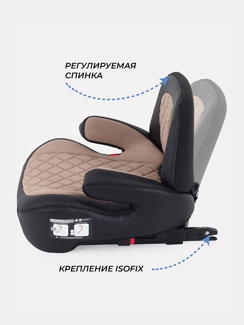 Бустер фиксируется в машине с помощью системы изофикс или с помощью штатного автомобильного ремня.