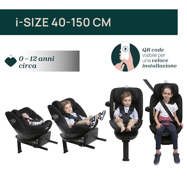 - Одобрено в соответствии со стандартом ECE R129/03 (i-Size) для детей ростом от 40 см до 150 см, охватывает весь период использования с рождения примерно до 12 лет.