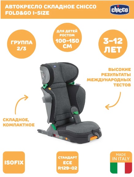 Складное автокресло Chicco Fold&Go I-Size (Чикко Фолд Гоу ай сайз ) - автомобильное сидение для ребенка от 3 лет и ростом от 100 до 150 см с компактным сложением и наклоном спинки. Автокресло соответствует стандарту безопасности i-Size (ECE R129), что гарантирует высокую защиту ребенка в автомобиле.