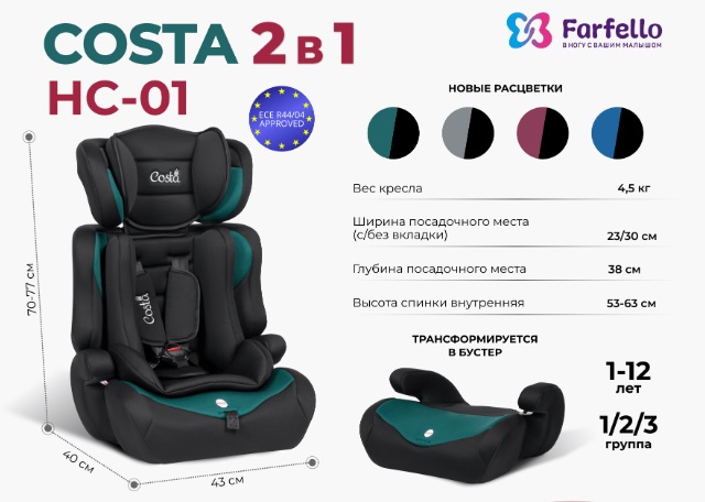 Автокресло Costa HC-01 (Коста) - детское универсальное автокресло для ребенка от 1 года до 12 лет . Автокресло выполнено из жесткого пластикового каркаса и удобного, дышащего материала. Вся обивка снимается для стирки, что позволит поддерживать чистоту в машине. Модель обладает выраженной боковой защитой и удобными мягкими подлокотниками. Для детей от 9-18 кг предусмотрены 5-ти точечные ремни безопасности, которые для более старших детей демонтируются.