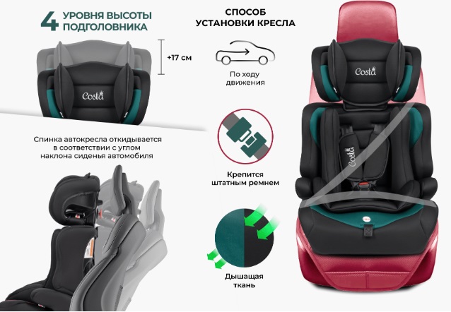 Крепится в автомобиле с помощью штатных ремней безопасности и устанавливается по ходу движения автомобиля.