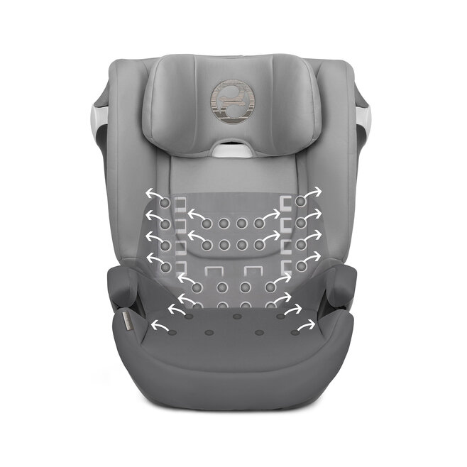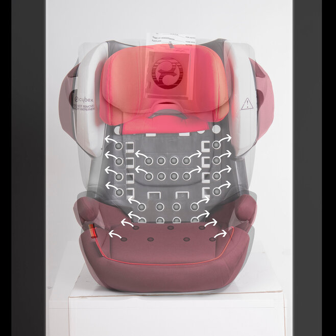 У кресла продуманная вентиляционная система. Вся спинка и бустер, на котором сидит ребенок выполнены с вентиляционными отверстиями. Они позволяют воздуху циркулировать между креслом и спиной ребенка, обеспечивая приятный микроклимат внутри. Ребенок будет меньше потеть, а поезду будут проходить комфортнее.