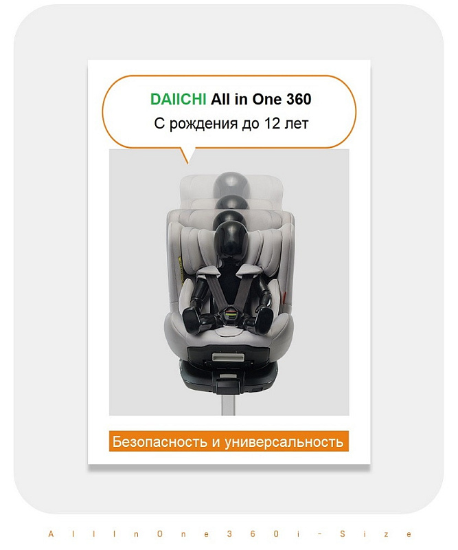 Автокресло Daiichi All-in-One 360 i-Size (Даичи ол-ин-ол 360 ай сайз) - детское автомобильное сидение для ребенка с рождения до 12 лет с высокими показателями безопасности от корейского производителя. Универсальное детское автокресло Daiichi All in One 360 соответствует последним европейским стандартам безопасности I-Size. Одобрение I-Size во всех режимах использования! 6 трансформаций внутренних вставок для безопасности и адаптации под рост и размеры ребенка.