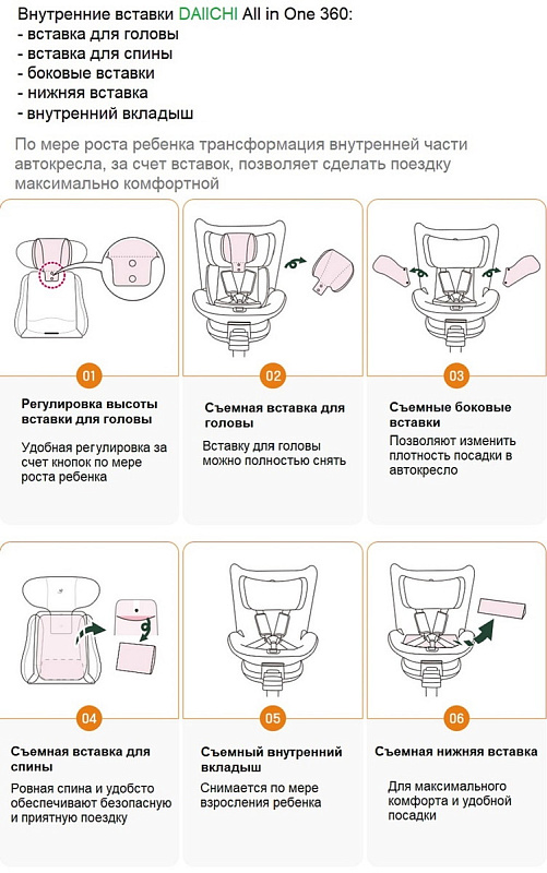 Съемная вставка для головы. Съемные боковые вставки позволяют изменить плотность посадки в автокресло. Съемная вставка для спины. Ровная спина и удобство обеспечивают безопасную и приятную поездку. Съемный внутренний вкладыш снимается по мере взросления ребенка. Съемная нижняя вставка для максимального комфорта и удобной посадки.