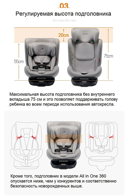Регулировка высоты подголовника от 55 до 77 см. Максимальная высота подголовника без внутреннего вкладыша - 77 см. Это позволяет поддерживать голову ребенка во всем периоде использования кресла. Кроме того, подголовник опускается ниже, чем у конкурентов и, соответственно, безопасность новорожденных выше.