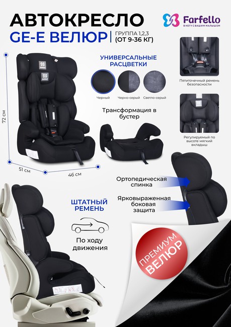Автокресло Farfello GE-E (фарфелло ) - универсальное и безопасное удерживающее устройство для детей от года до 12 лет. Приятные и яркие расцветки обязательно понравится вашему ребенку. Такое кресло станет верным спутником в поездках на машине с ребенком, и обеспечит безопасность и удобство в поездке.