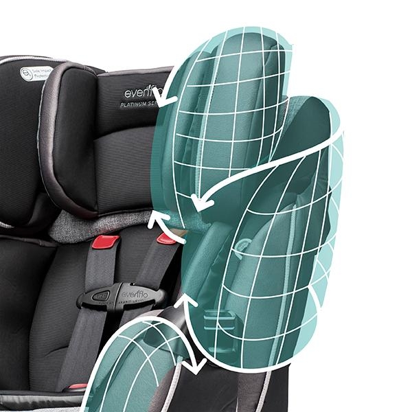 - Infinite Slide Harness™ - эксклюзивная разработка Evenflo. Теперь плечевые ремни можно зафиксировать в любом положении по высоте. Недоступный ранее уровень комфорта и безопасности!;