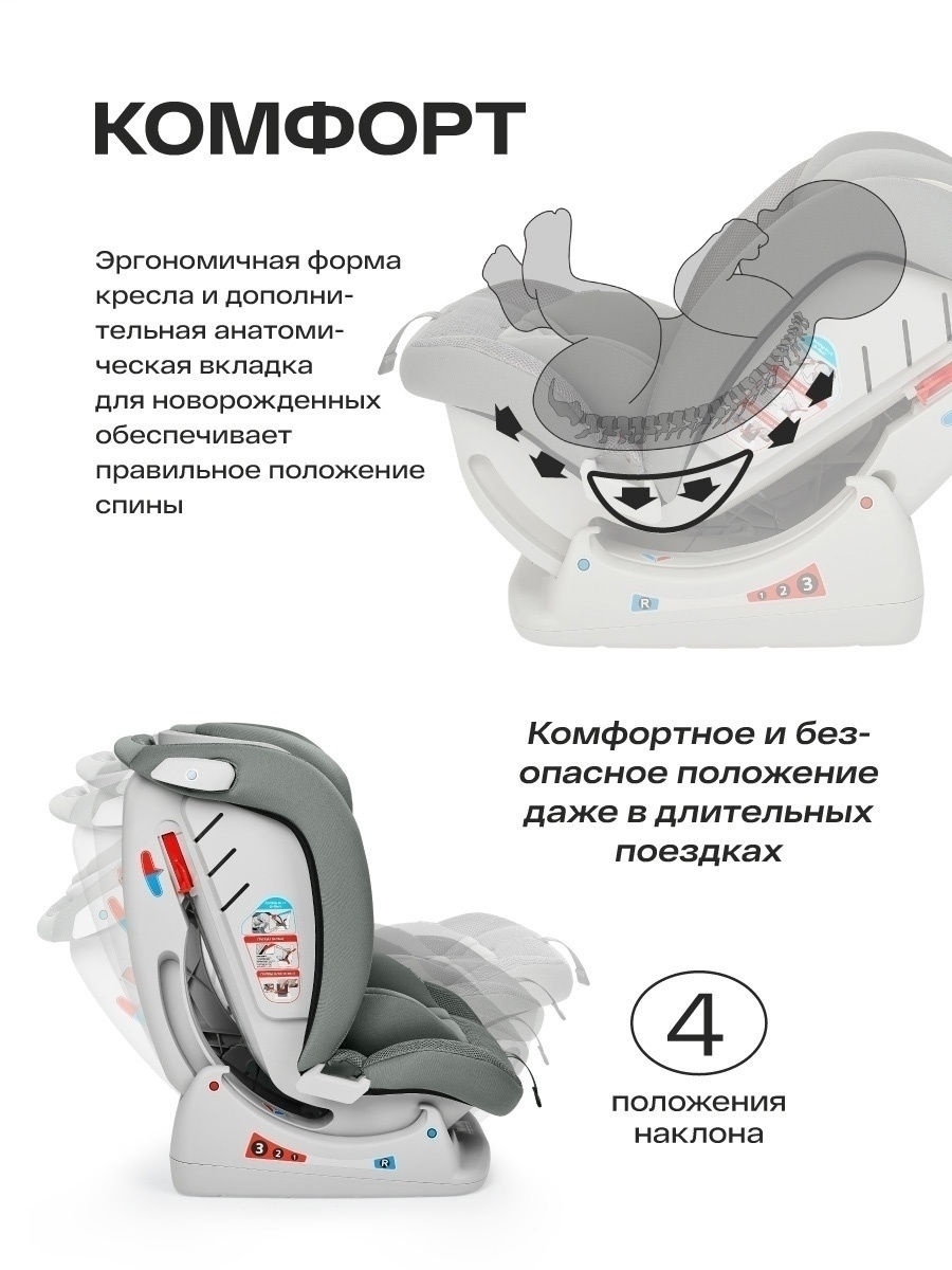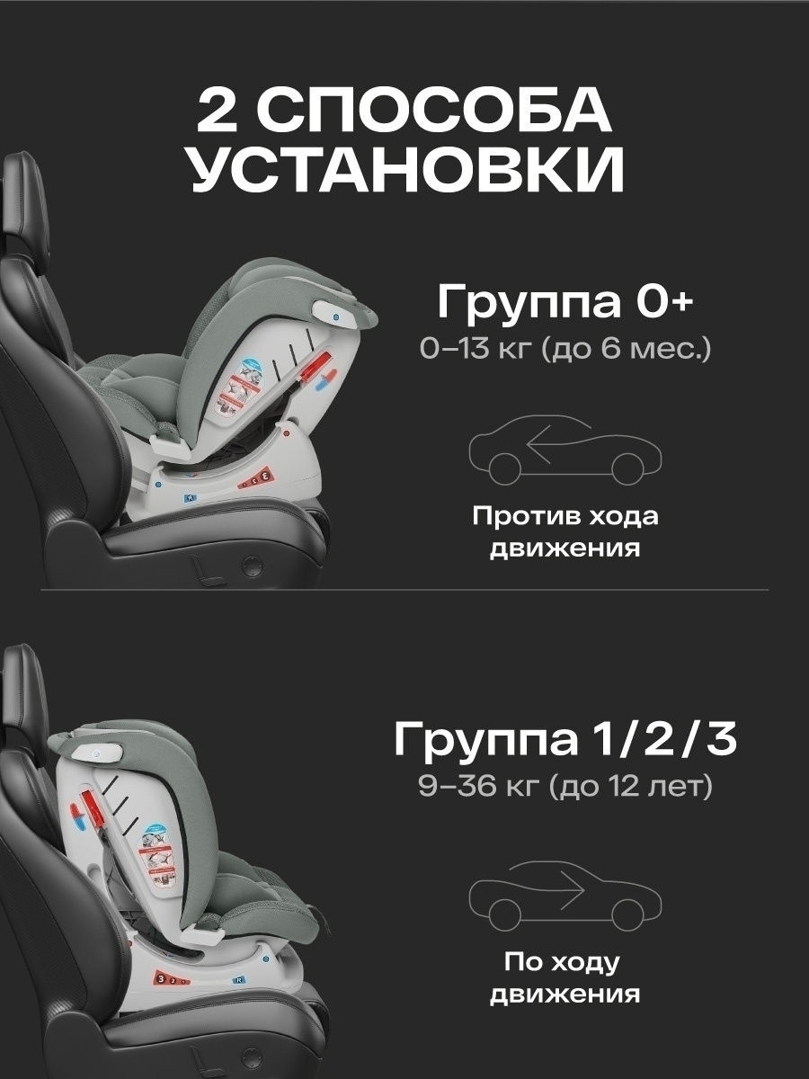 Модель крепится по ходу и против хода движения с помощью обычного штатного ремня и подойдет в любой автомобиль.