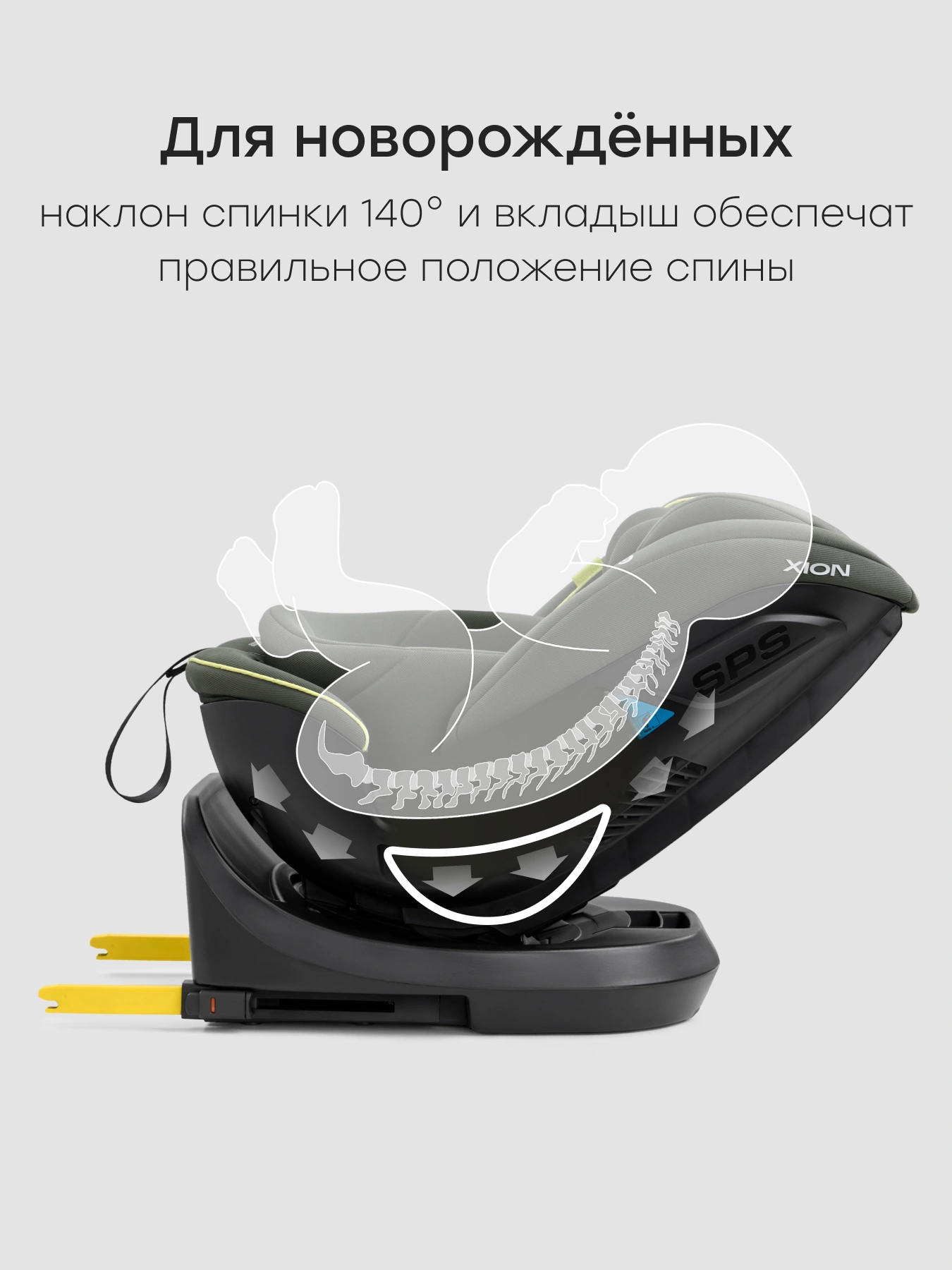 Для новорожденного ребенка предусмотрен специальный вкладыш, который поддерживает малыша со всех сторон, бережно защищая и делая поездку комфортнее. Наклон спинки в 140 градусов обеспечит правильное положение спины.