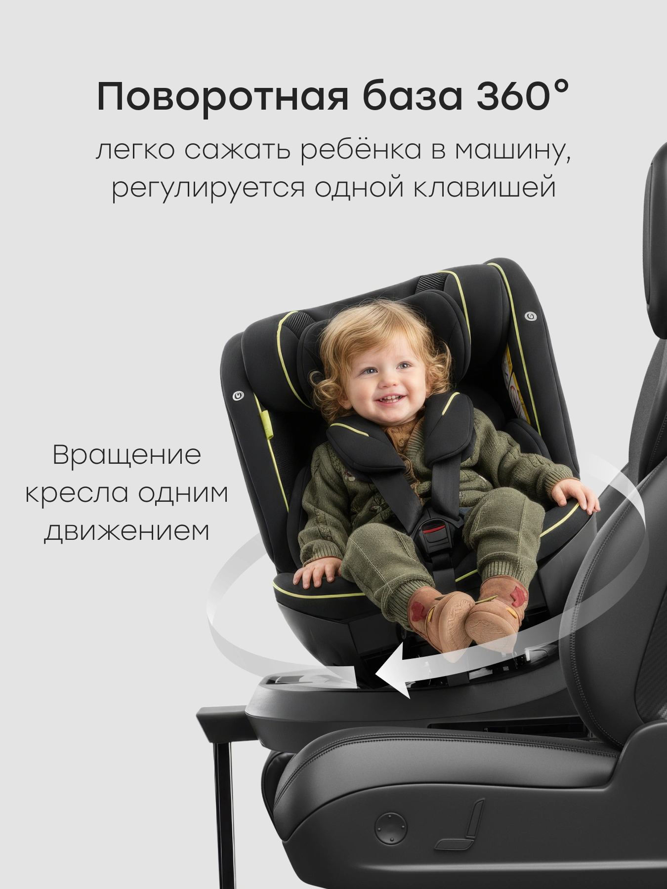 Для удобства родителей предусмотрена поворотная на 360 градусов база. Чаша автокресла будет легко поворачиваться к ближайшей двери или вовнутрь салона, позволяя легко сажать и вынимать ребенка, переодевать во время остановок или кормить. Вся обивка снимается для стирки и выполнена из качественных премиальных тканей. Специальные магнитики будут удерживать ремни безопасности для удобного пристегивания ребенка.