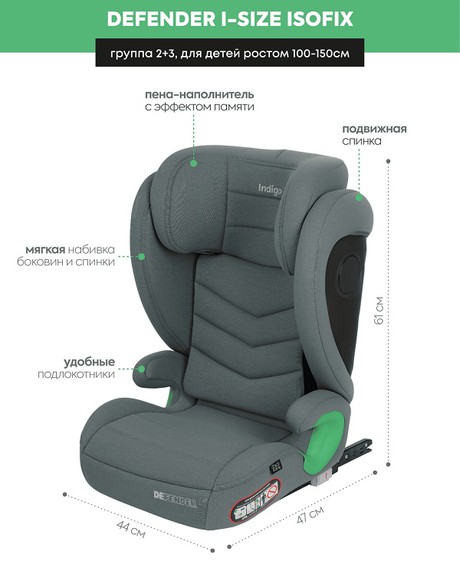 Автокресло Indigo DEFENDER isofix (Индиго дефенде) - удобное и безопасное автокресло для ребенка от 3 до 12 лет (ростом от 100 до 150см). Модель произведена и сертифицирована в соответствии с последним европейским стандартом безопасности, который предусматривает тест на боковой удар. Это гарантирует дополнительную защиту маленького пассажира. Размеры модели позволяют ребенку чувствовать себя комфортно даже в зимней одежде. Автокресло фиксируется с помощью системы крепления Isofix или при ее отсутствии с использованием штатных 3-х точечных ремней безопасности, поэтому может быть установлено в абсолютно любой автомобиль. Ребенок также пристегивается штатным 3-х точечным ремнем безопасности автомобиля. Когда маленький пассажир подрастет (от 135 до 150см) кресло можно трансформировать в бустер.