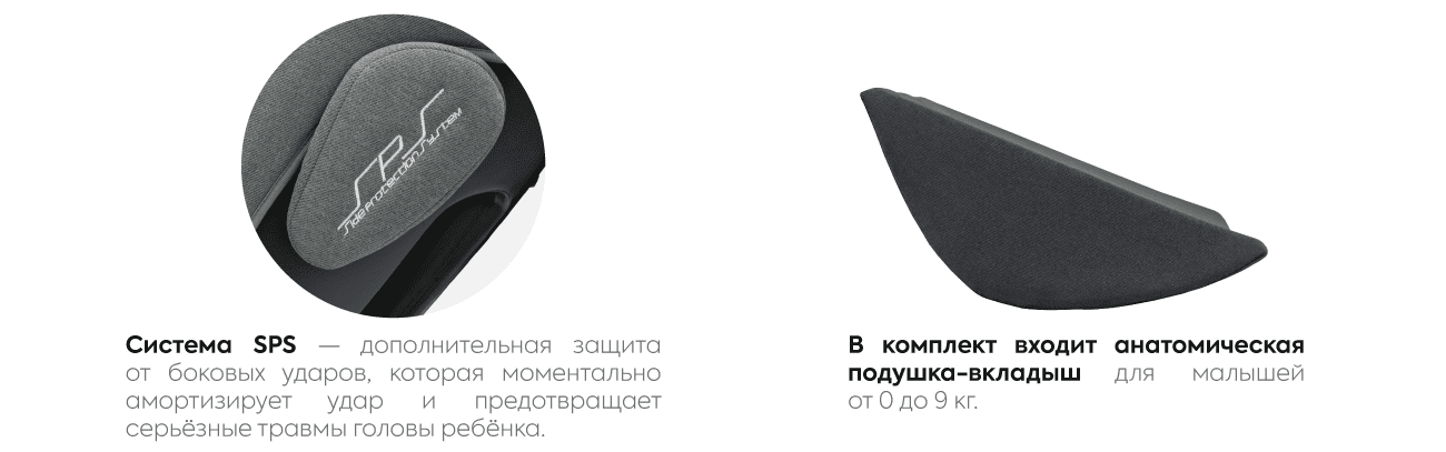 Для дополнительной защиты ребенка автокресло оснащено системой SPS - дополнительная защиты от боковых ударов, которая моментально амортизирует удар и предотвращает серьезные травмы головы ребенка.