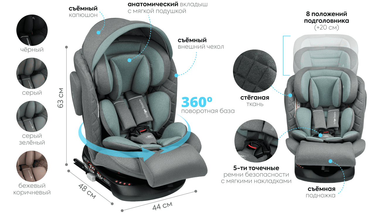 - Удобство и безопасность для малышей: специальный анатомический вкладыш с мягкой подушкой обеспечивает максимальный комфорт и поддержку для самых маленьких пассажиров. Дополнительные внутренние пятиточечные ремни безопасности гарантируют их надежное крепление в кресле.