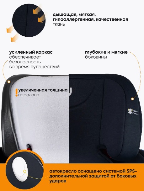 Оснащена поворотной базой, для удобной посадки и высадки малыша, наклоном спинки, внутренними 5-точечные ремни с мягкими накладками.
