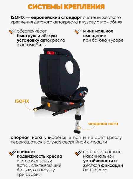 Отличительной особенностью данной модели является наличие телескопического упора и крепления Isofix. Упорная «нога» необходима для более жесткой фиксации кресла в машине, предотвращения “кивка” при фронтальном столкновении автомобиля и повышения уровня стойкости. Крепление ISOFIX обеспечивает легкую, но надежную установку. Надежно фиксирует устройство и не допускает его движения вперед и в стороны.