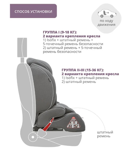 - Крепление с помощью системы изофикс или с помощью штатного автомобильного ремня.
