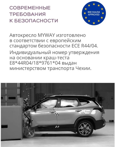 Автокресло прошло ряд испытаний, и соответствует европейскому стандарту безопасности ECE R44/04.