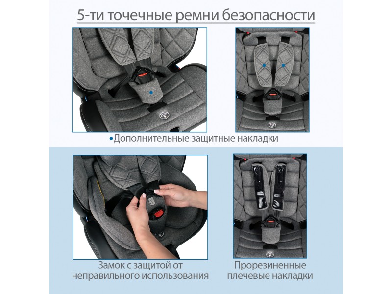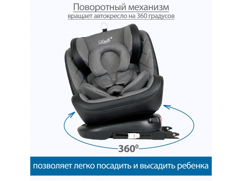 - поворотный механизм (кресло вращается на 360°) и фиксируется в 4 положениях (лицом вперед, спиной вперед, левым или правым боком по ходу движения), что позволяет легко посадить ребенка в машину и значительно облегчает высадку;