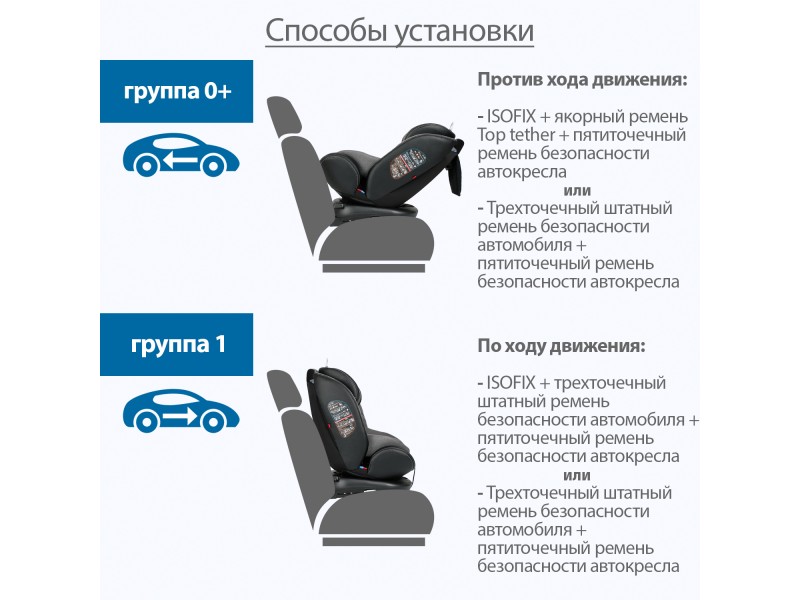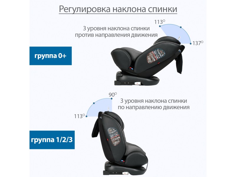 - 3 положения наклона спинки против хода движения и 3 положения наклона спинки по ходу движения автомобиля;