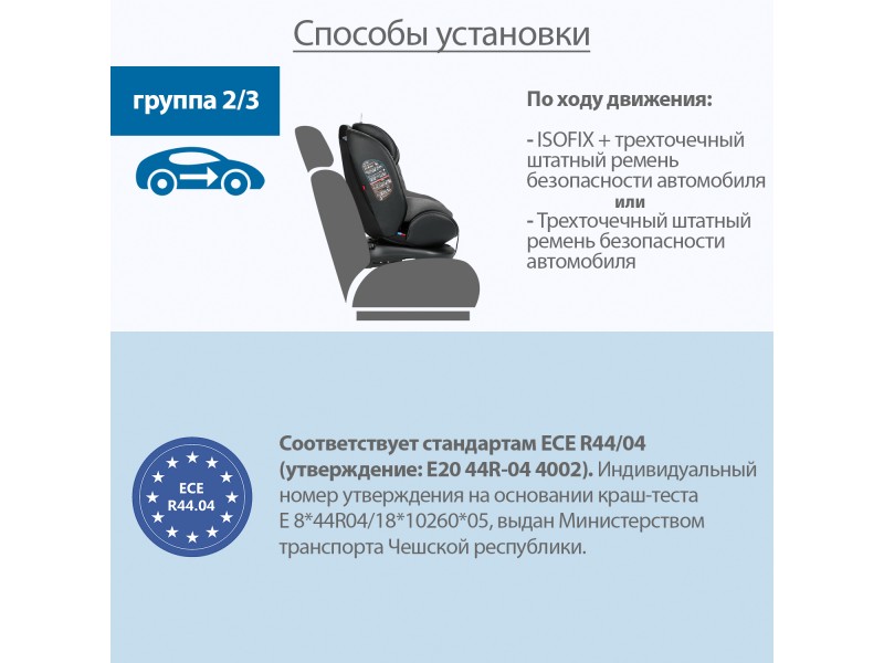 - соответствует стандартам ECE R44/04 (утверждение: E20 44R-04 4002). Индивидуальный номер утверждения на основании краш-теста E 8*44R04/18*10260*05, выдан Министерством транспорта Чешской республики;