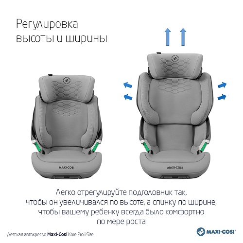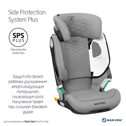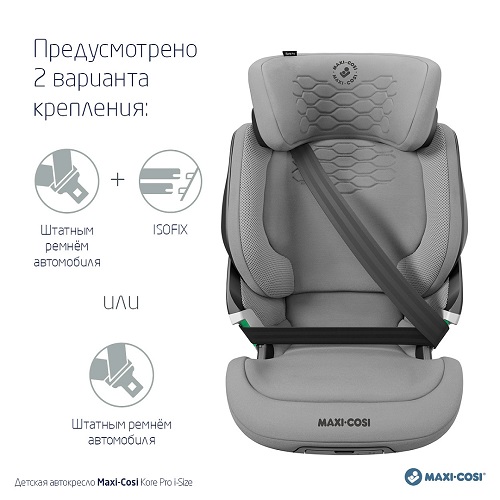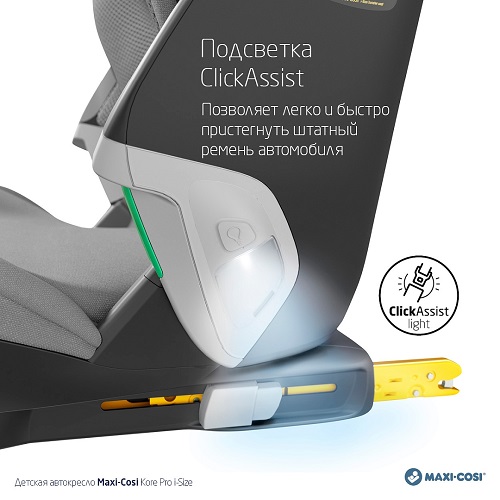 Автокресло Maxi-Cosi Kore Pro i-Size (Макси кози Коре Про Ай сайз) - автомобильное кресло, которое растет вместе с ребенком по высоте и ширине и рассчитано на рост от 100 до 150 см. Модель относиться к группе 2-3 и предназначена для детей от 3,5 лет. В таком возрасте дети хотят самостоятельности и новое кресло дает им такую возможность. Специальный дизайн модели позволит детям самостоятельно залазить и слазить с кресла и пристегиваться. Уникальная система Click Assist light подсветит замок, чтобы ребенку было удобнее и проще пристегнуться. Kore Pro i-Size также предлагает лучшую безопасность. Он соответствует самым последним и самым высоким стандартам безопасности - правилам размера i - в сочетании с системой Side Protection.