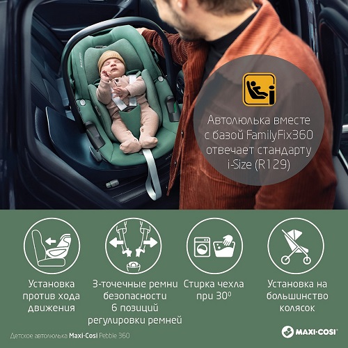 Автокресло Maxi-Cosi Pebble 360 (Макси кози Пебл 360) - современное детское автокресло, которое обеспечивает лучшую безопасность малыша и соответствует новому стандарту i-Size (R129) и поворачивается на 360 градусов. Его легко использовать благодаря возможности использованию с базой FamilyFix360. Установка Pebble 360— это установка в одно мгновение с визуальным и звуковым подтверждением правильности установки. Инновационная система ремней позволяет легко посадить ребенка в автокресла или вынуть его оттуда. Особенности: Стандарт безопасности i-Size (R129)