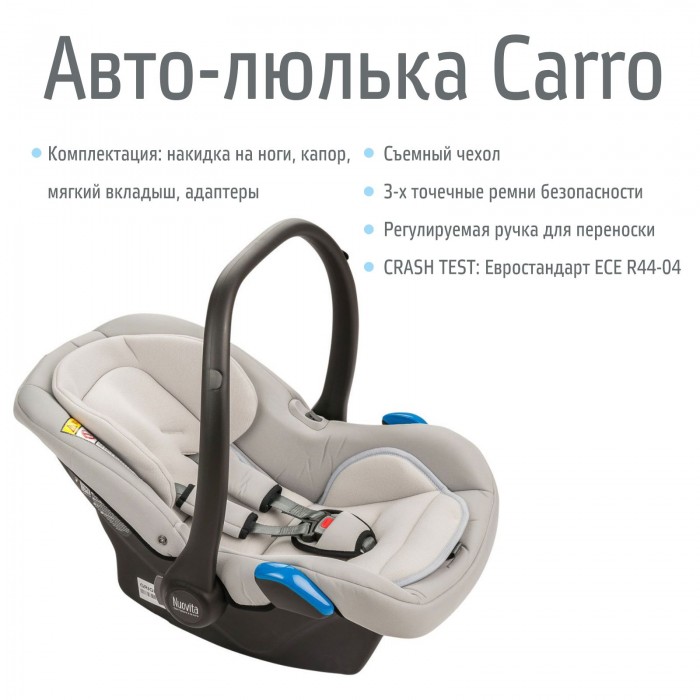 Автокресло Nuovita Carro (Нуовита Карро) - безопасная и легкая автолюлька для самых маленьких пассажиров. Ее вес всего 3,6 кг, она удобная, надежная и практичная. В машине автокресло устанавливается с помощью штатных ремней безопасности против хода движения, на коляску устанавливается с помощью адаптеров в комплекте.