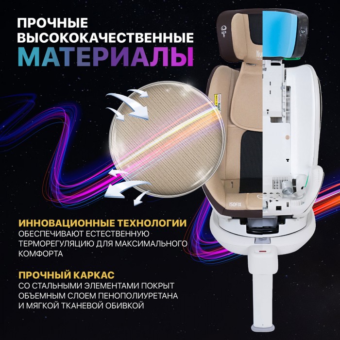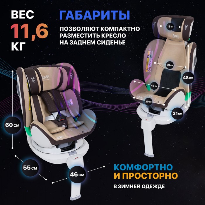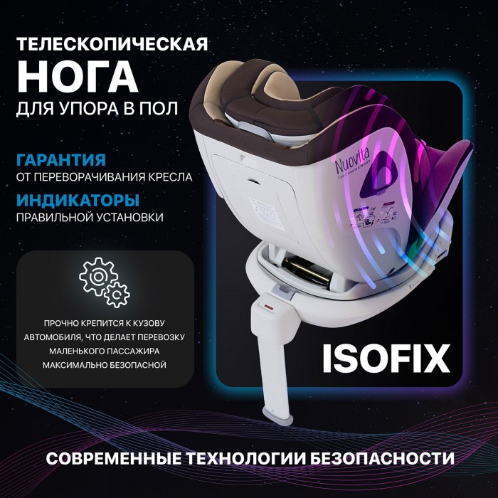 Автокресло имеет два варианта установки: для новорожденного ребенка - против хода движения, и для детей постарше - по ходу движения. Модель оборудована базой isofix, которая позволит правильно и надежно установить кресло в машине и упором в пол от опрокидывания кресла вперед.