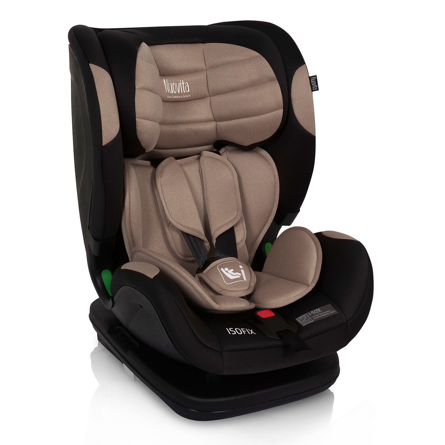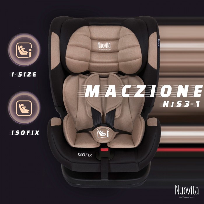 Nuovita Maczione NiS3-1 (Нуовита) - автокресло из Италии изготовлено в соответствии с новейшим стандартом безопасности I-Size. Кресло имеет расширенную боковую защиту и прошло краш-тест на сопротивление боковым ударам. Может использоваться для малышей с 9 месяцев до 12 лет (1/2/3 группы). Автокресло отличается продуманной эргономикой и комфортно для долгих путешествий, имеет удобную регулировку подголовника и режим наклона спинки для сна. Предназначено для автомобилей с Isofix, поставляется с базой.