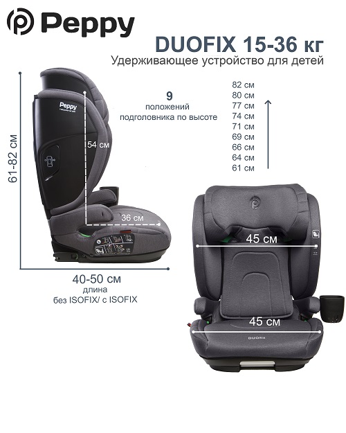 Автокресло Peppy DUOfix I-Size (Пеппи дуо фикс) - комфортное и безопасное автокресло для ребенка от 3 до 12 лет. Автокресло "растет" вместе с ребенком, изменяясь по высоте и ширине. Все настройки кресла максимально простые и удобные и позволят быстро настроить автокресло под размеры ребенка. А пристегнуться на столько просто, что даже маленький ребенок сможет сделать это самостоятельно. А самое главное, оно безопасно и удобно, так как боковины и подголовник расширяются, создавая пространство, идеально подходящее для роста вашего ребенка.
