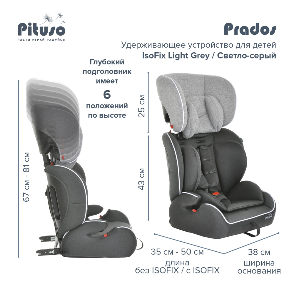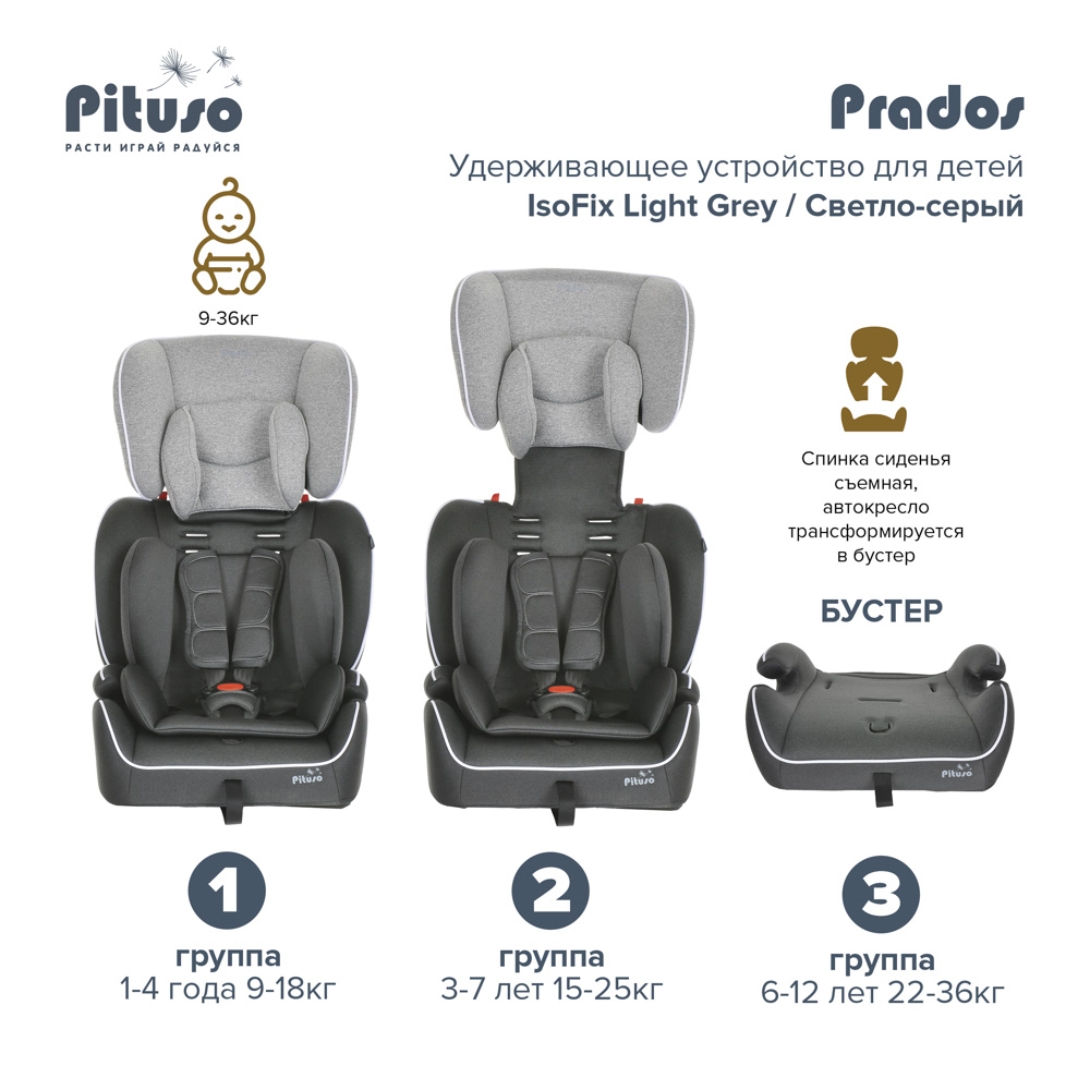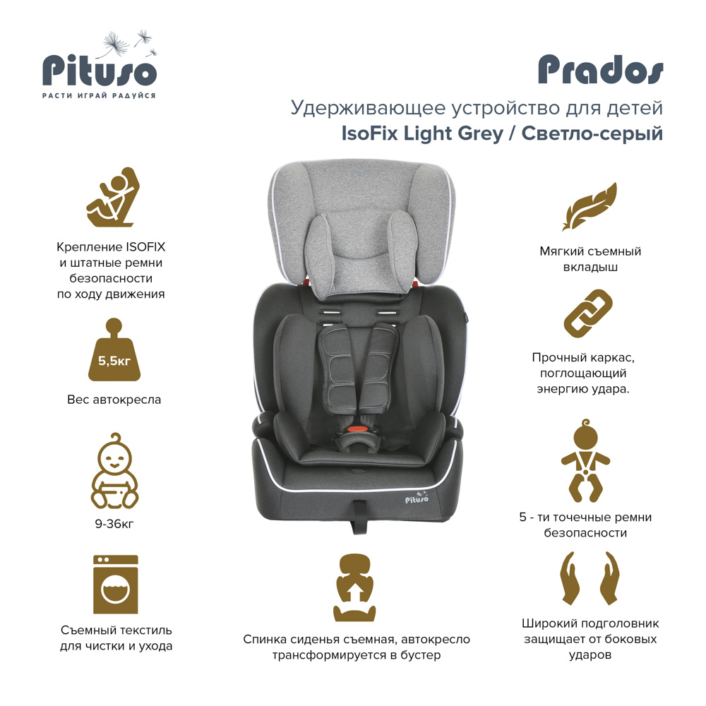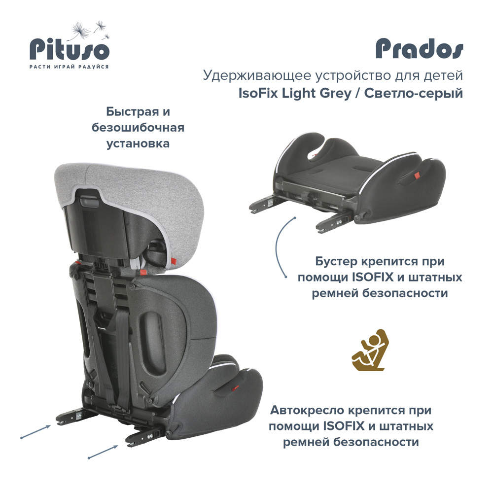 Автокресло PITUSO Prados Isofix (Питусо Прадо изофикс) - универсальное и практичное автомобильное сидение для ребенка от 1 года до 10-12 лет. Очень просто крепится в любой автомобиль, легкое для переноски, а вся обивка снимается для стирки. Модель выполнена из ударопрочного пластика, что обеспечит безопасность ребенка в машине. Сидение в автокресле просторное и удобное. Небольшие подлокотники позволят удобно разместиться в кресле во время длительной поездки. Спинка съемная, что позволит превратить кресло в бустер при необходимости. 5-ти точечные ремни рассчитаны для детей до 3-4 лет, а потом легко убираются. Для дополнительного комфорта детей от 1 года предусмотрен мягкий анатомический вкладыш.