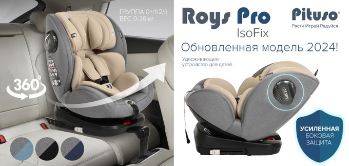 Автокресло PITUSO Roys Pro (Питусо ройз про) - безопасное, и что, немало важно, очень комфортное автокресло для ребенка с 0 до 12 лет. Поворотная база дает возможность поворачивать автокресло на 360 градусов, то есть к ближайшей двери для посадки и высадки ребенка, при остановке вовнутрь салона для кормления, по ходу и против хода движения для безопасной поездки в зависимости от возраста ребенка. Автокресло крепиться в салоне автомобиля с помощью системы изофикс и упора в пол, что позволит, во-первых, быстро и правильно установить автокресло в машине, а во-вторых, при поворачивании автокресла вам ни чего не будет мешать (например, якорный ремень).