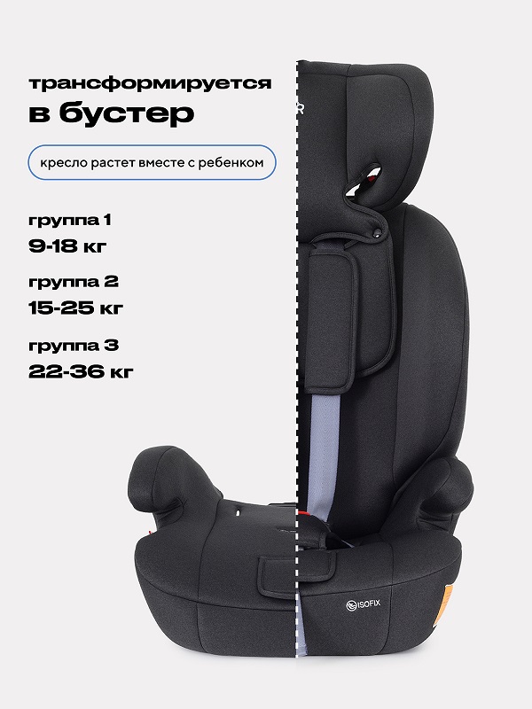 - для ребенка от 3 лет (от 15 кг) в автокресле демонтируются внутренние ремни безопасности и ребенок фиксируется вместе с автокреслом штатным автомобильным ремнем. Для дополнительной безопасности и удобства использования автокресло можно фиксировать системой изофикс.
