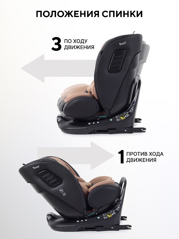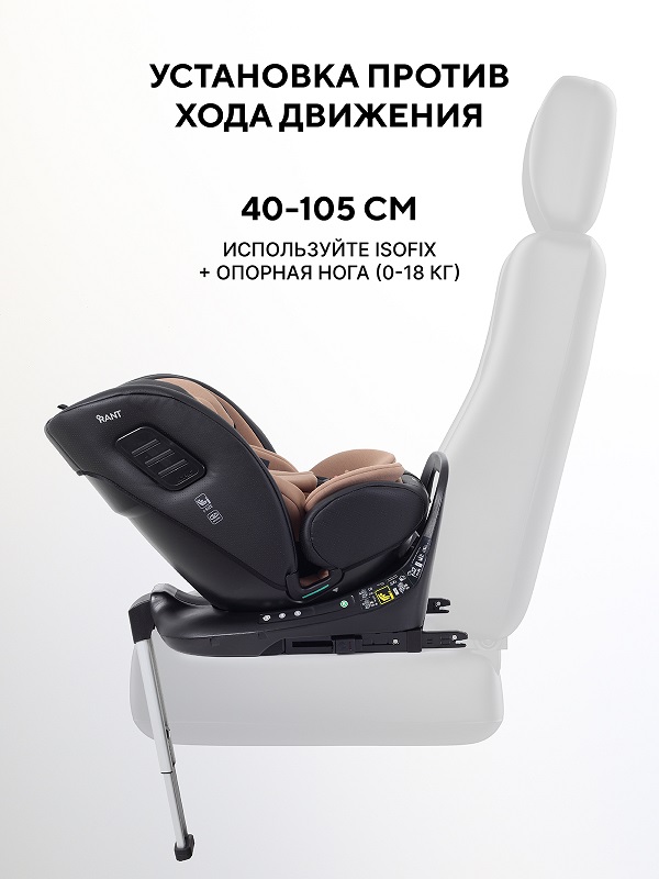 - 40–105 см (0-18 кг): против хода движения ISOFIX + опорная нога