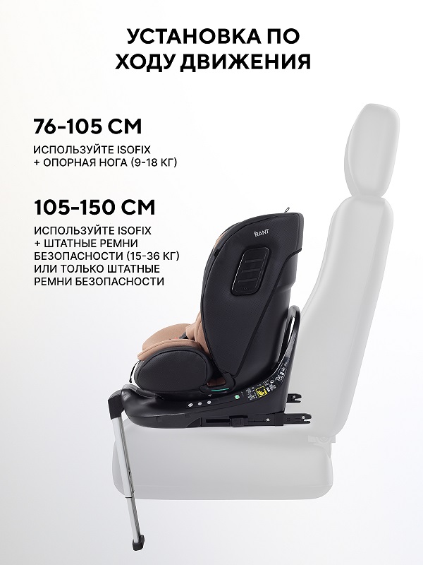 - 76–105 см (9-18 кг): по ходу движения ISOFIX + опорная нога