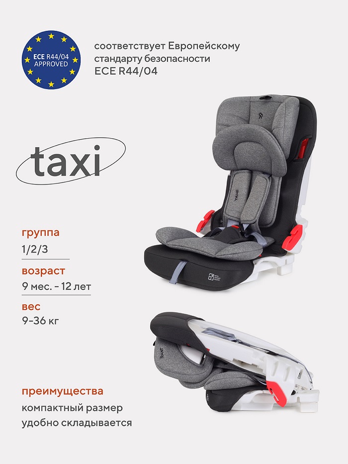 Автокресло Rant Taxi (Рант Такси) - уникальное автокресло с легким весом и быстрой системой сложения до компактных размеров. Это кресло удобно использовать для поездок на такси, каршеринге, на поездках на машине с друзьями. С таким устройством вам не придется заказывать специальное детское такси для поездки с ребенком до поликлиники или магазина. При этом, не смотря на свои компактные размеры в сложенном виде, это полноценное, сертифицированное автокресло для ребенка от 9 месяцев до 12 лет. Автокресло имеет свои 5-ти точечные ремни безопасности, регулируемый подголовник и приятную качественную обивку. Очень простое в использовании и эксплуатации.