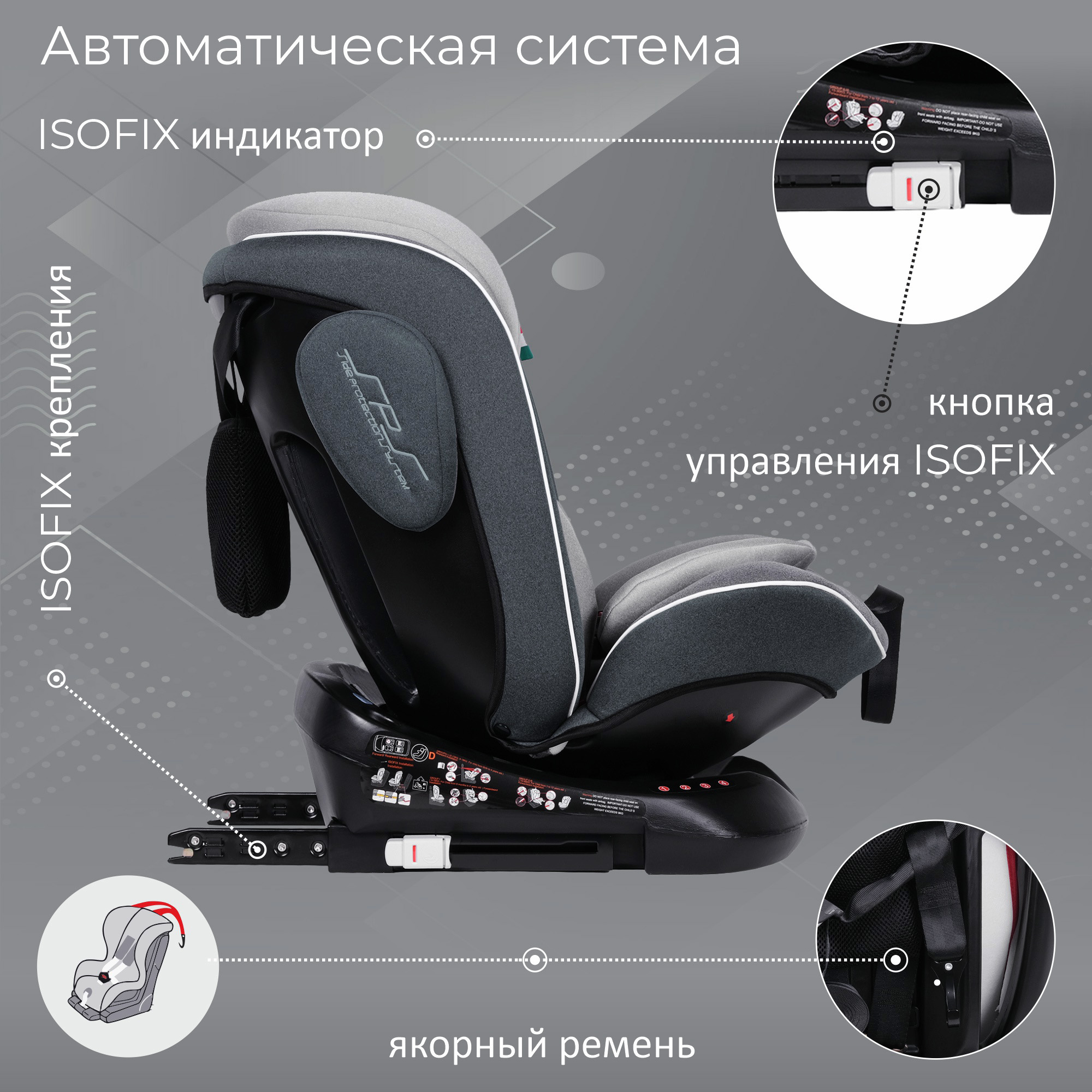 Установка в машину с помощью системы Isofix и якорного ремня.