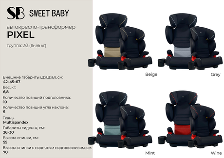 Автокресло Sweet Baby Pixel (свит беби пиксель) - современное автокресло для ребенка от 3 до 10-12 лет, от 15 до 36 кг. Автокресло оснащено системой изофикс, что позволит быстро и надежно зафиксировать автокресло в машине. Если системы изофикс в машине нет, или необходимо перевозить ребенка на переднем сидении автомобиля, автокресло вместе с ребенком фиксируется штатным автомобильным ремнем.