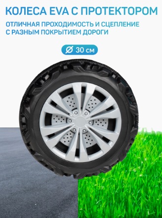 - Колеса EVA с протектором (диаметр 30 см): отличная проходимость и сцепление с разным покрытием дороги (будь это трава или асфальт).