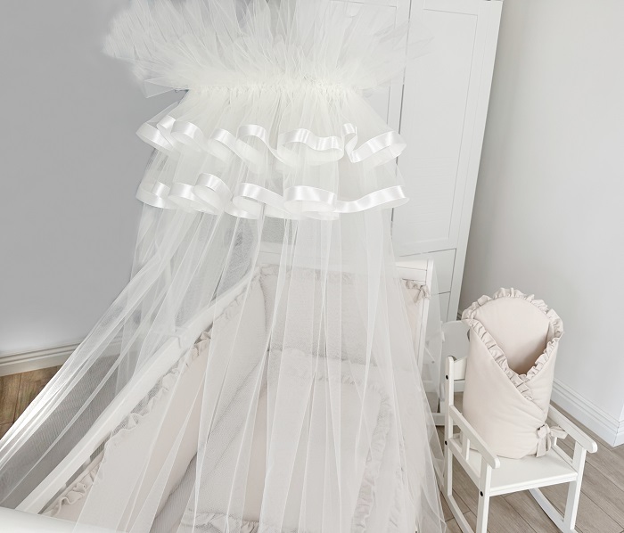 Балдахин в кроватку Lepre (лепре) - аксессуар, который не только создаст дополнительный уют в кроватке, но и придаст кроватке изящества и волшебства. Очень красивый балдахин из легкой, полупрозрачной ткани с хорошей длиной и хорошим объемом ткани. Балдахин смотрится очень нежно и невесомо. Помимо красоты поможет оградить ребёнка от яркого освещения, сквозняков и назойливых насекомых, формируя ощущение уюта и безопасности.