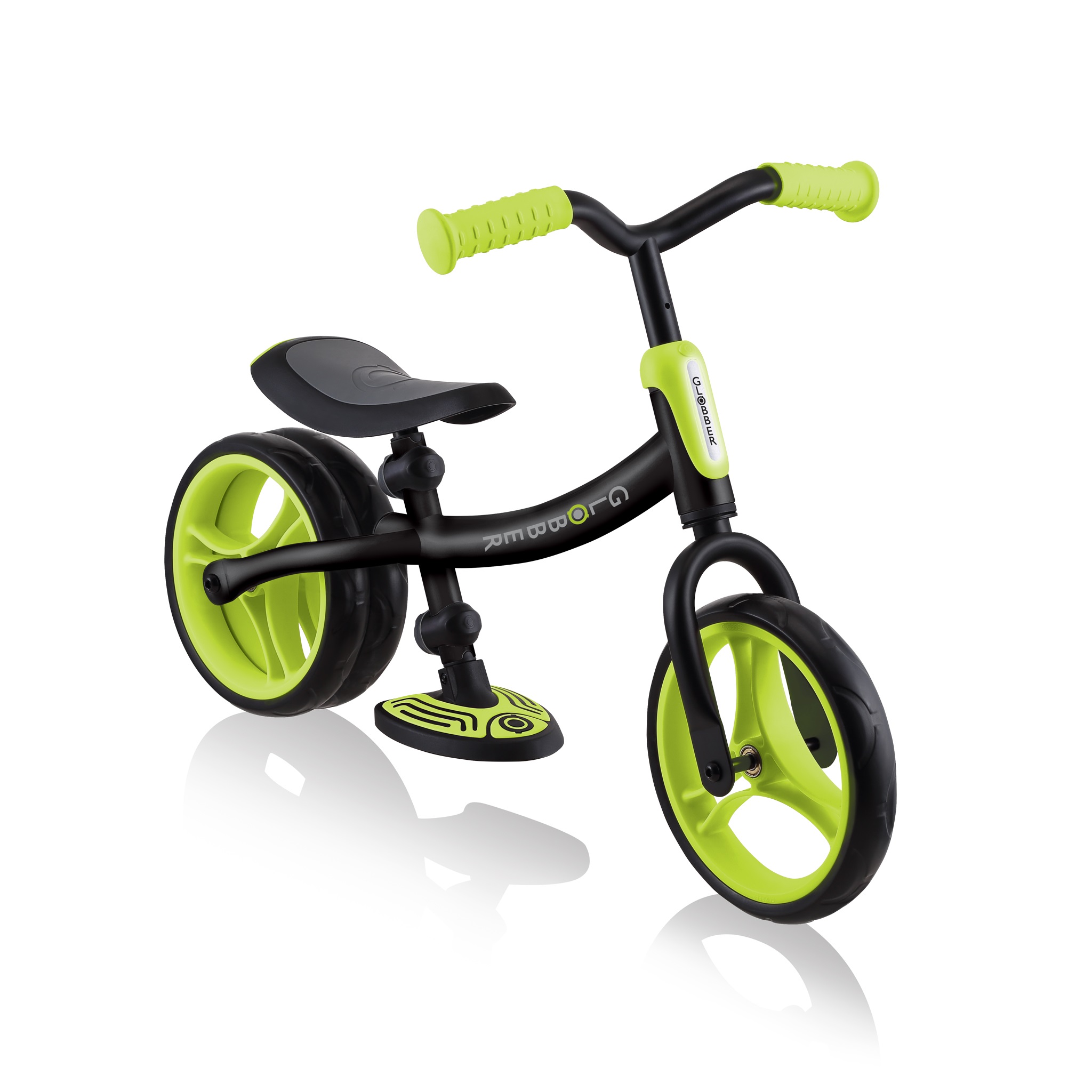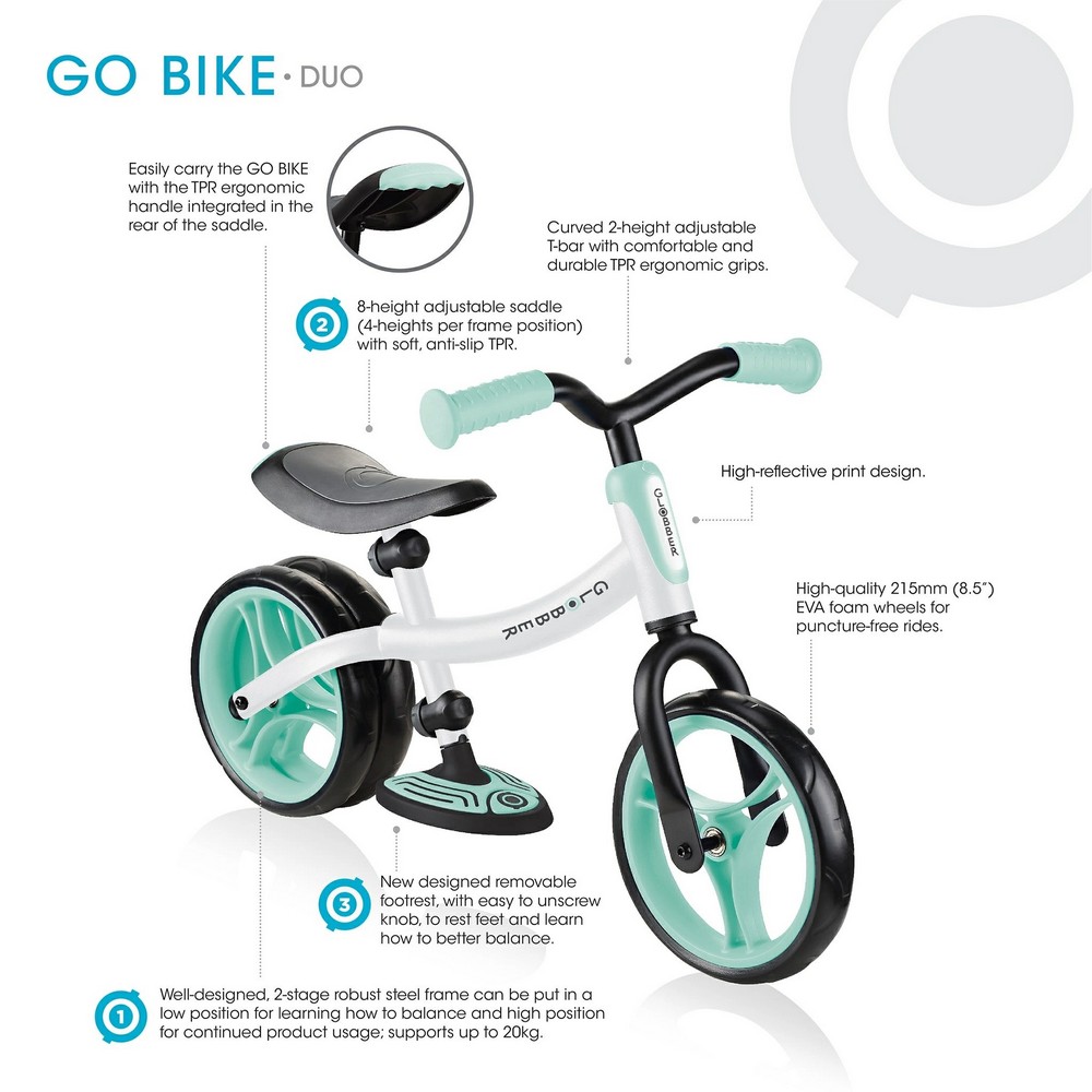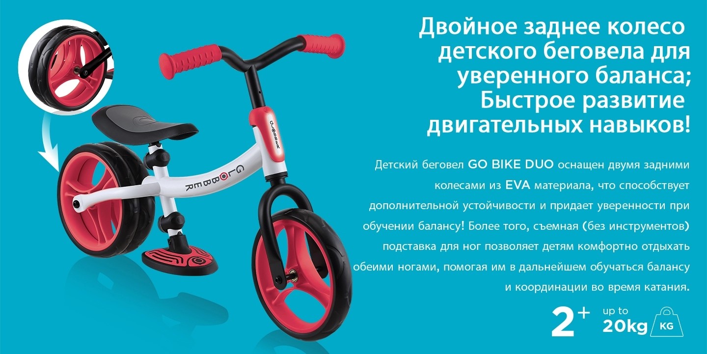 Беговел GLOBBER GO BIKE DUO (Глоббер гоу байк дуо) - уникальный беговел, который научит ребенка балансу и равновесию. Беговел имеет возможность подстраиваться под разный уровень катания ребенка. Если ребенок только осваивает новый транспорт, то он оценит функцию "двух колес" сзади. Такой беговел устойчив и надежен. Он не опрокинется, и ребенок сможет спокойно разобраться с новым транспортом. Когда ребенок освоит катание на беговеле, задние колеса меняются на одно. С одним задним колесом беговел будет более спортивный, быстрый и подарит массу положительных эмоций ребенку.