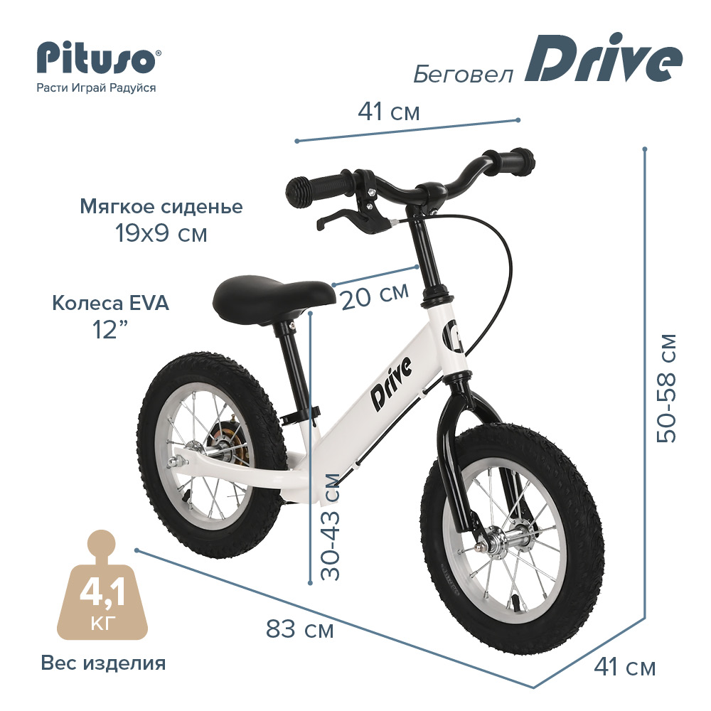 Беговел PITUSO Drive (Питусо драйв) - уникальный динамичный дизайн и очень удобный набор функций для катания ребенка от 3 лет. У велобега качественные надувные колеса, а значит, ребенок сможет ездить по любому бездорожью. Регулировка руля и высоты сидения позволит пользоваться беговелом долго и удобно. Ручной тормоз поможет контролировать скорость беговела.