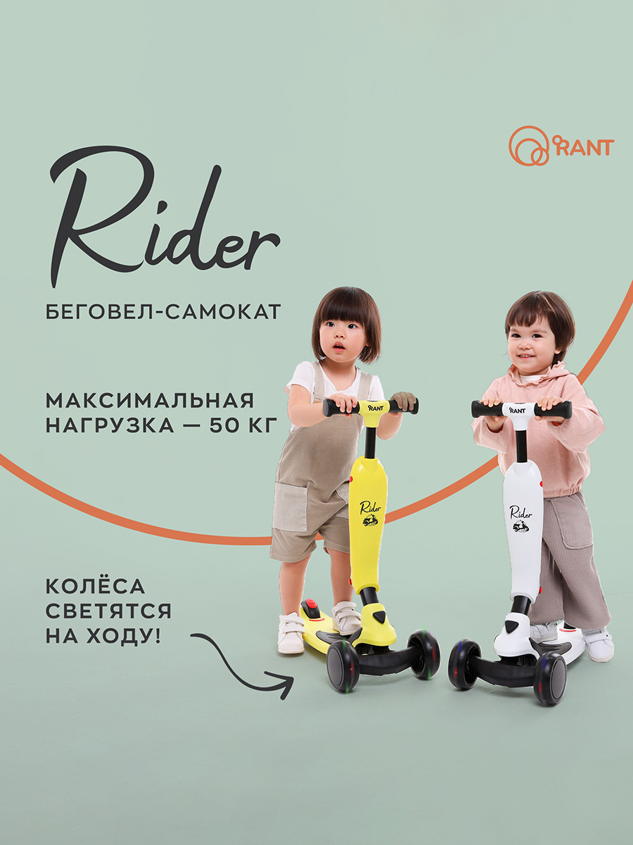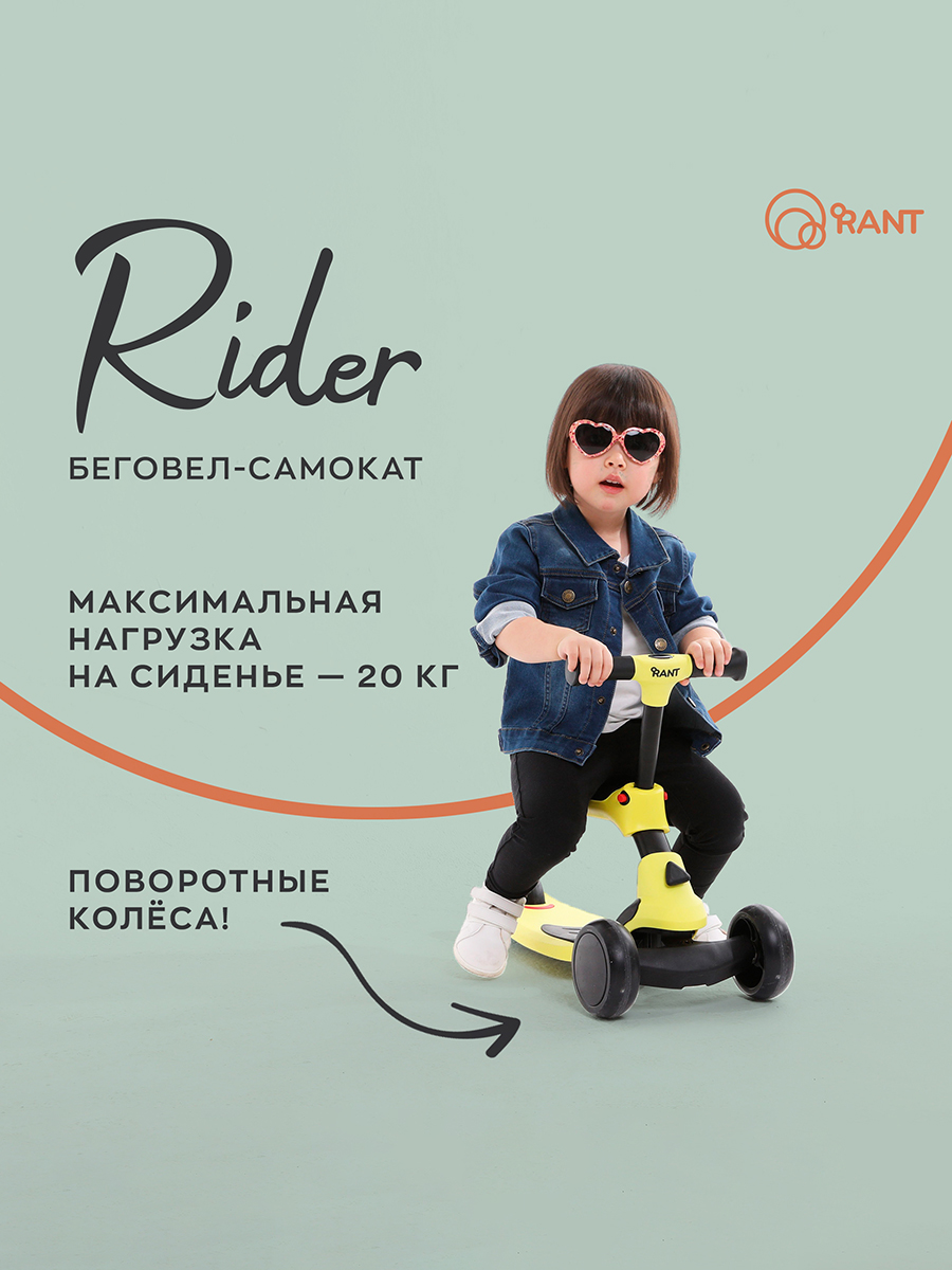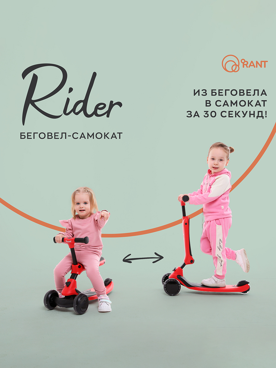 Беговел-самокат Rant Rider (Рант райде) - уникальный самокат -трансформер который подарит ребенку массу положительных эмоций на прогулке. Этот самокат может использоваться как для самых маленьких в виде каталки-беговела, так и для детей от 3 лет в виде полноценного самоката. Максимальная нагрузка на сидение - 20 кг, на самокат 50 кг. Для удобства пользования моделью трансформация с каталки в самокат осуществляется всего за 30 секунд. Передние колеса светятся при катании.