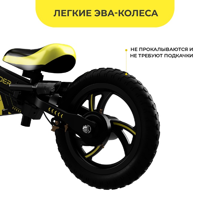При этом это очень легкий и удобный беговел с регулируемой ручкой и сидением. Качественные Ева колеса не боятся проколов, уверенно справляются с любым бездорожьем, весят максимально мало и не когда не сдуваются. Спортивный дизайн беговела делает его похожим на настоящий мотоцикл. "Байкерские" рукоятки не скользят и дают возможность удобно управлять беговелом.