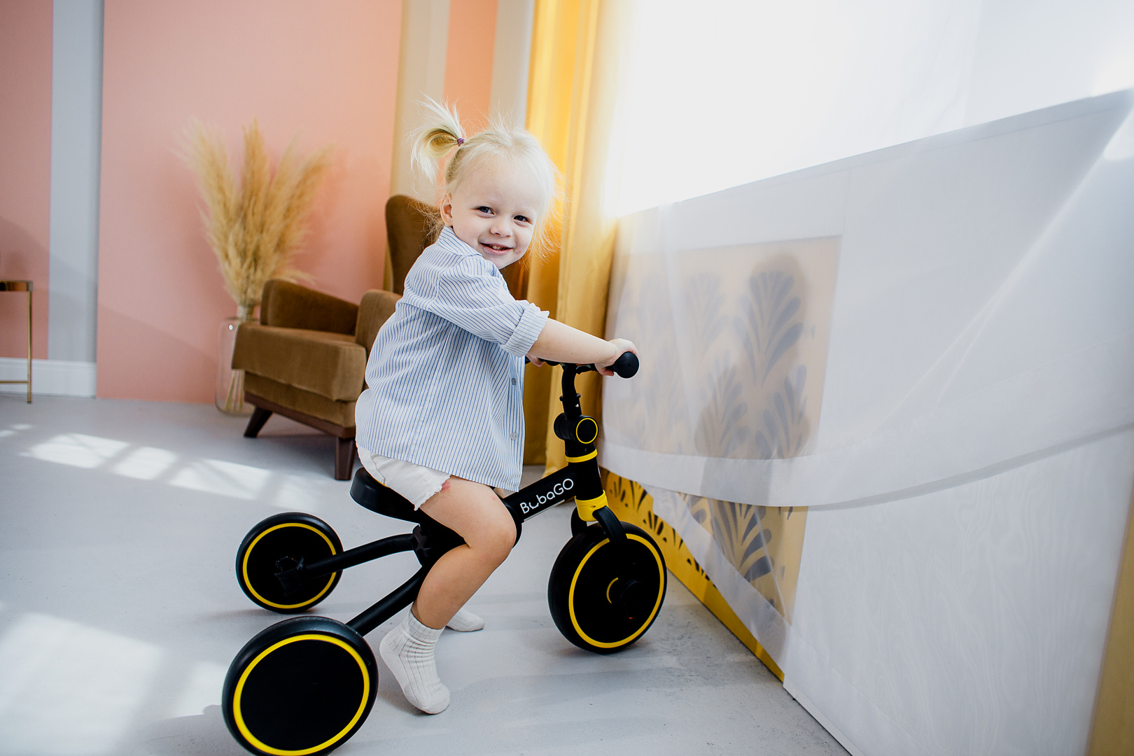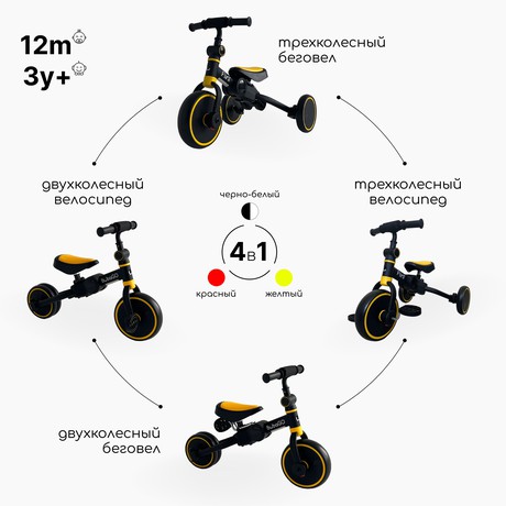 1. Трехколесный беговел - В этой конфигурации педали велосипеда и ручка сняты. Ребенок сидит на сидении и медленно отталкивается ногами;