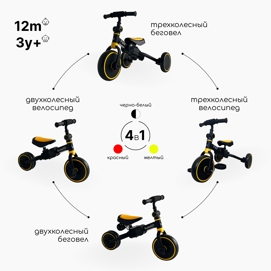 Беговел трансформер Bubago Flint 4 в 1 (Бубагоу Флинт) - уникальный транспорт, который подарит ребенку выбор на чем кататься сегодня. При этом во время прогулки малыш может менять вид транспорта по своему усмотрению - разве это не прекрасно?! Детский беговел Flint рассчитан на возраст от 1 до 4 лет и на рост от 75 до 104 см. и включает сразу 4 видов трансформации, которые легко менять.