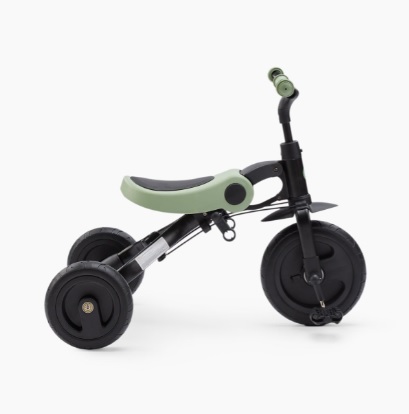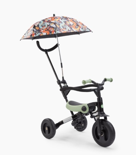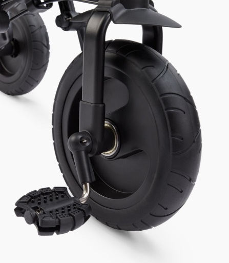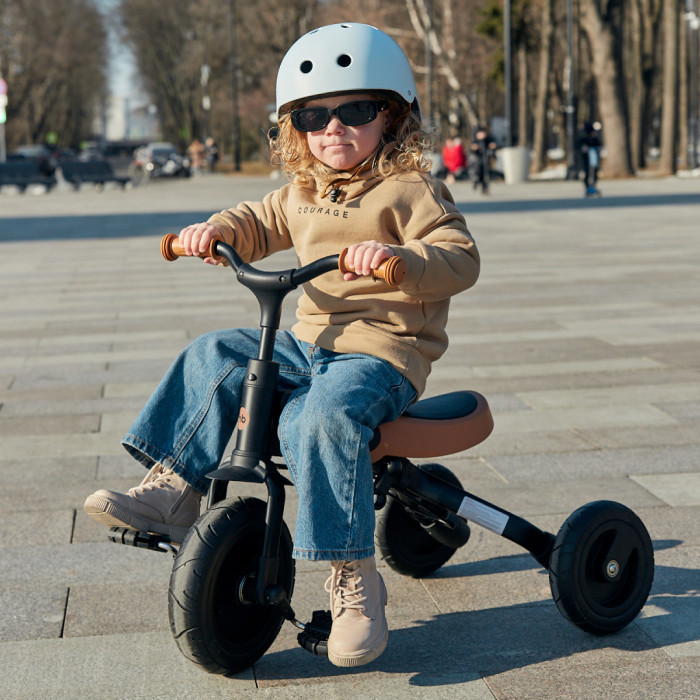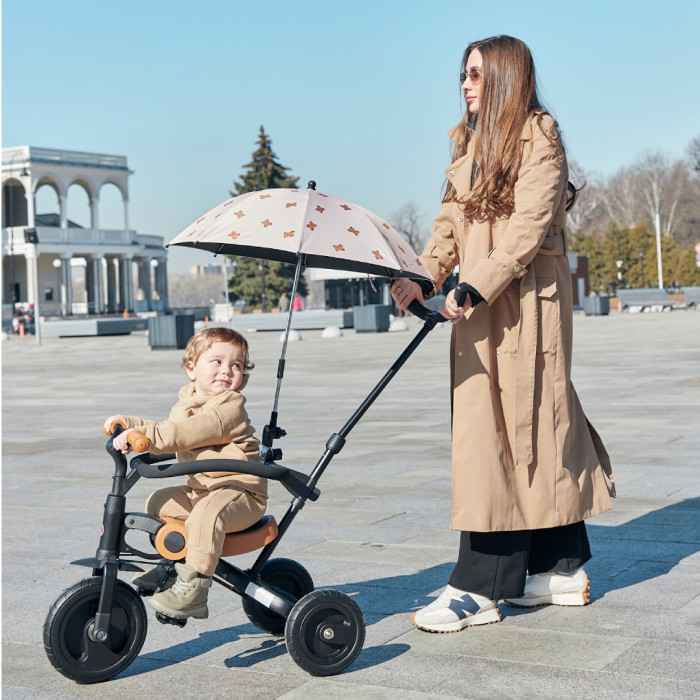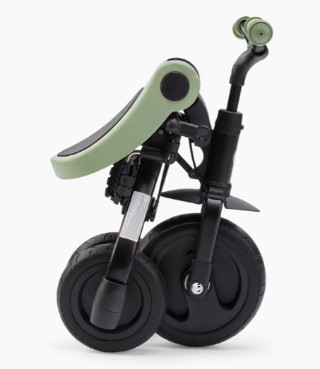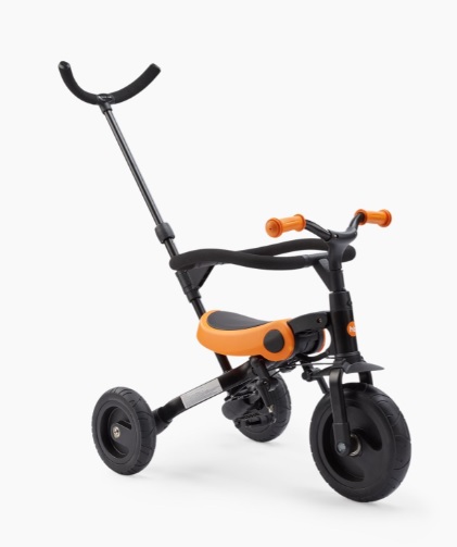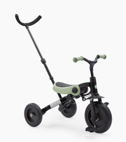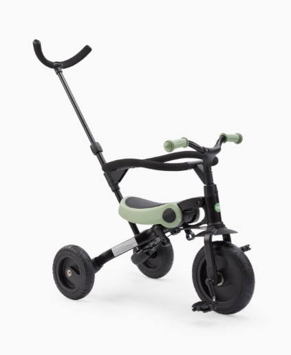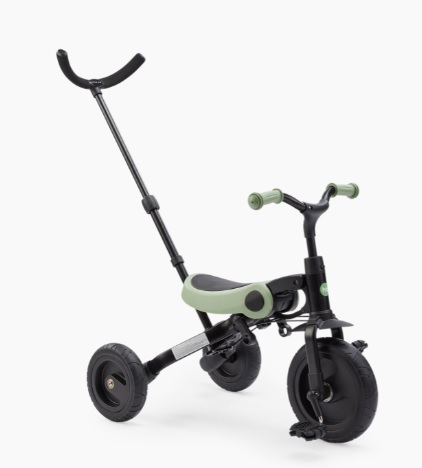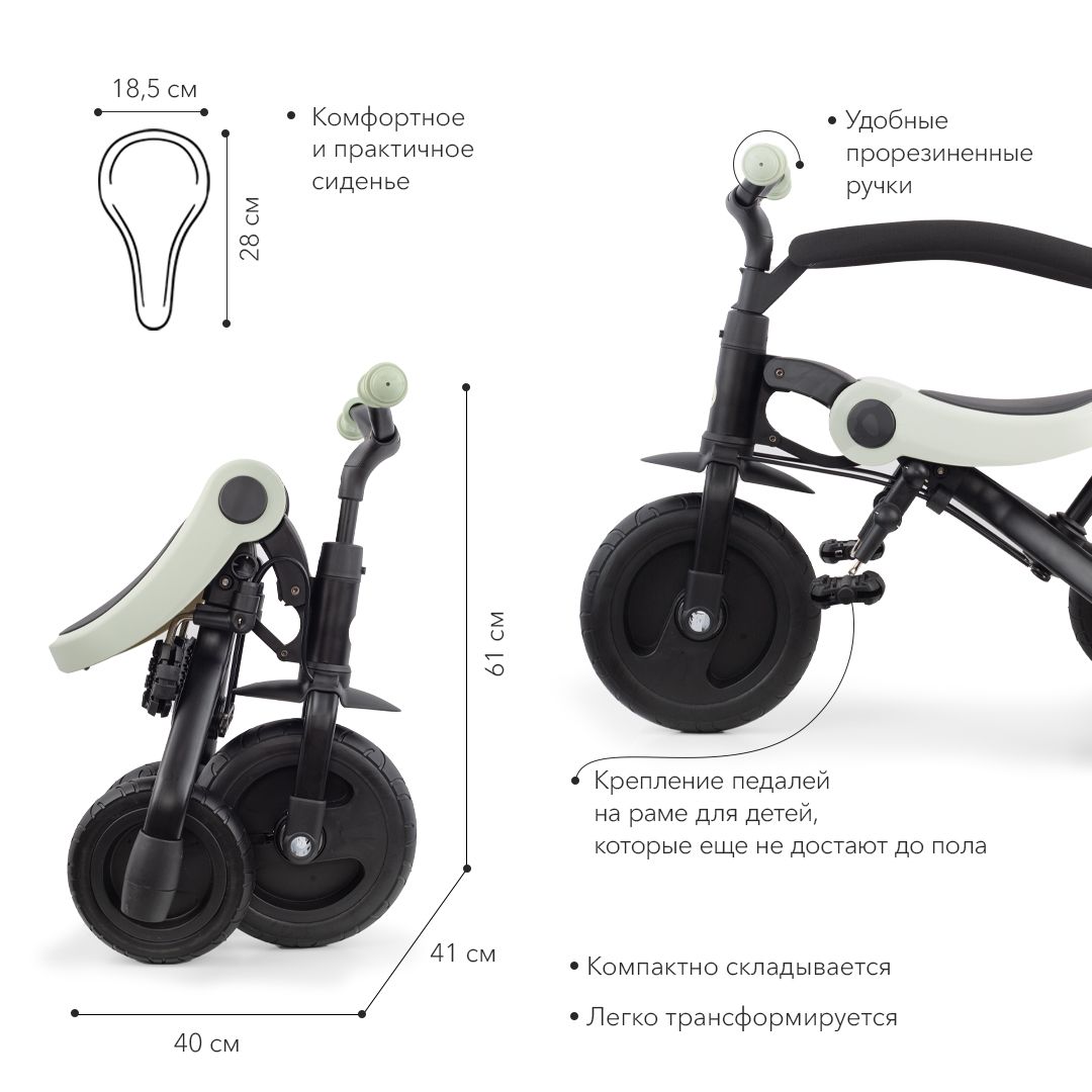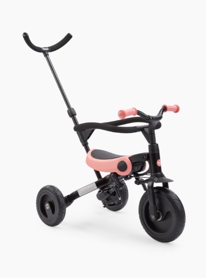 Есть 4 варианта трансформации: каталка для самых маленьких, трехколесный велосипед с установленной ручкой для родителей, трехколесный велосипед и беговел для самостоятельной езды. Для безопасности в режиме каталки есть съемный бампер и режим холостого хода у педалей. Съемная ручка для родителей телескопическая: минимальная высота от пола 69 см, а максимальная 94 см.